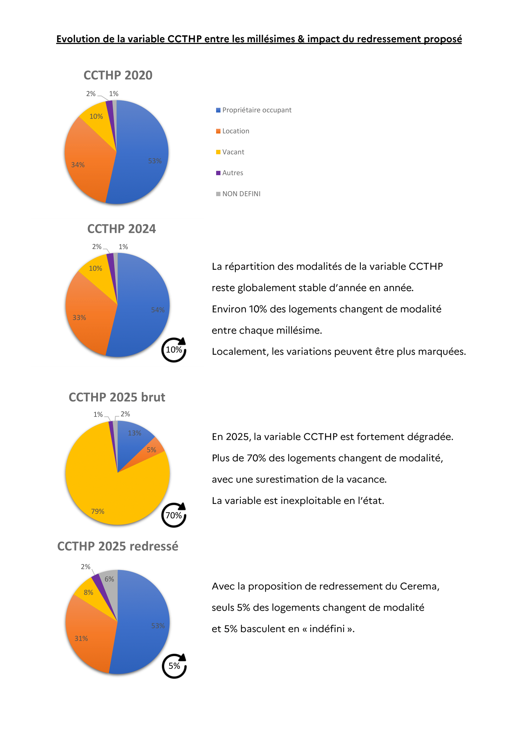 Jusqu'au millésime 2022, la variable ccthp était issue de la taxe d'habitation. A partir des millésimes suivants, la mise à jour de cette variable s'est dégradée, particulièrement en 2025. Le dispositif GMBI qui permet aux propriétaires de déclarer leur patrimoine permet désormais de collecter les données d'occupation mais les modalités d'accès pour les acteurs publics ne sont pas encore définies.