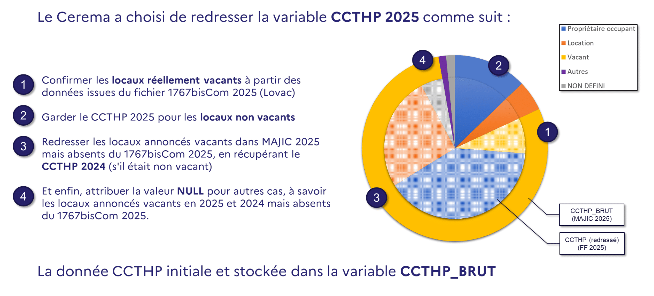 Depuis la suppression de la taxe d’habitation sur les résidences principales, la variable CCTHP n’est plus correctement alimentée, particulièrement dans les fichiers MAJIC 2025. Le Cerema, en lien avec la DGALN, a décidé, pour le millésime Fichiers fonciers 2025, de mettre en place un redressement spécifique fondé notamment sur les données Lovac (qui bénéficient de l'information issue du dispositif GMBI) afin d’en limiter la dégradation.